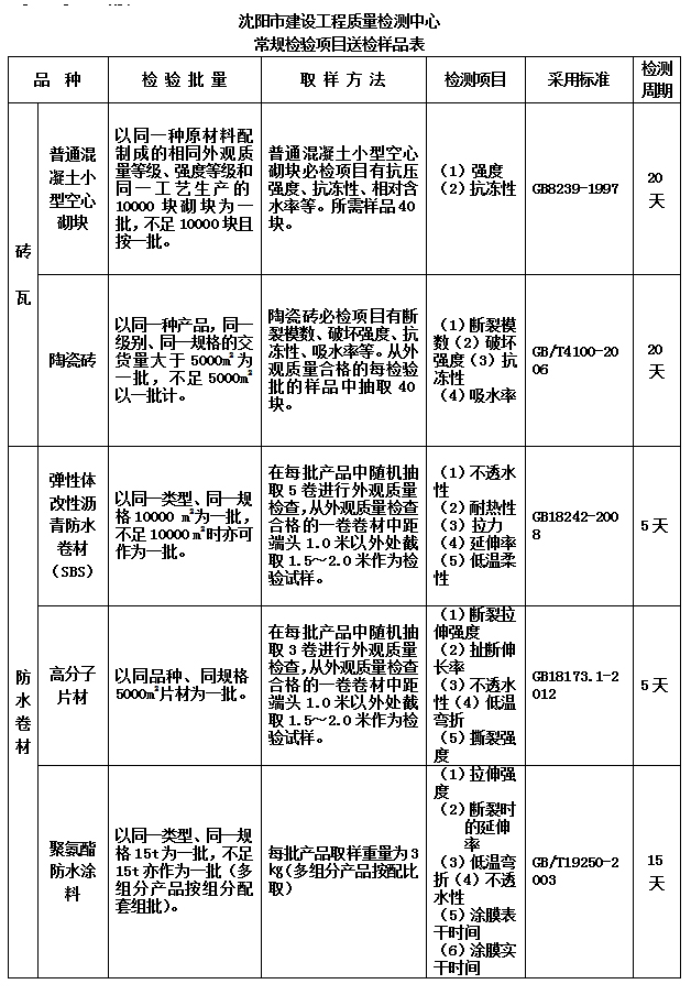 12、防水材材:彈性體改性瀝青防水卷材、塑性體改性瀝青防水卷材、瀝青復合胎柔性防水卷材、膠粉改性瀝青玻纖氈與玻璃網格布增強防水卷材、膠粉改性瀝青玻纖氈與聚乙烯膜增強防水卷材、膠粉改性瀝青聚酯氈與玻纖網格布增強防水卷材、聚氯乙烯防水卷材、氯化聚乙烯防水卷材、石油瀝青玻璃纖維胎防水卷材、改性瀝青聚乙烯胎防水卷材、高分子防水片材、止水帶、遇水膨脹橡膠、自粘聚合物改性瀝青防水卷材、水泥基滲透結晶型防水材料、聚氨酯防水涂料、聚合物水泥防水涂料、聚合物乳液建筑防水涂料;